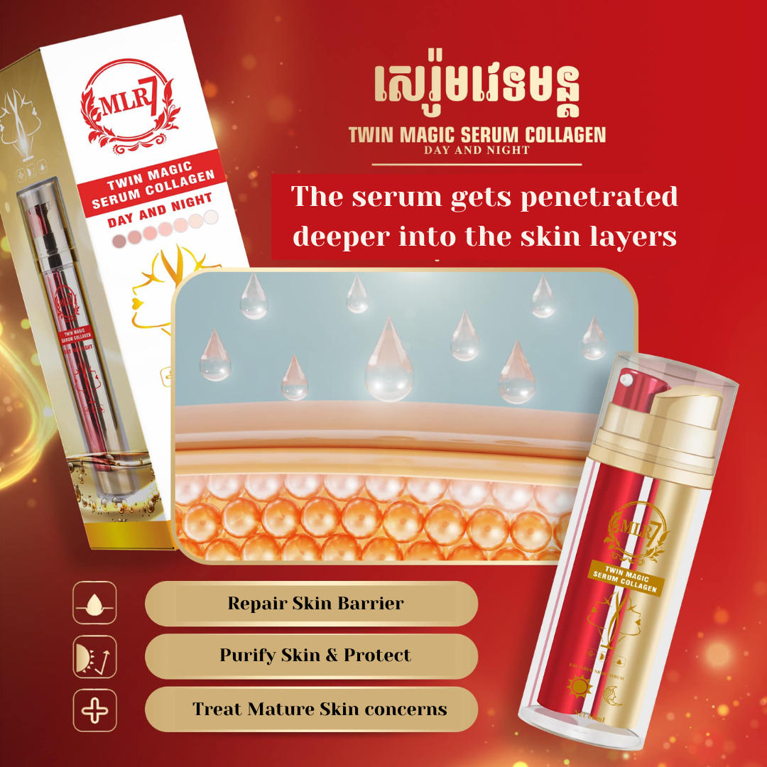 Twin Magic Serum is a game-changer for your skincare routine. With just one bottle, you get the power of both Day (Gold) and Night (Red) serums. This powerful formula repairs your skin barrier, purifies and protects against free radicals, and treats wrinkles and dark spots.